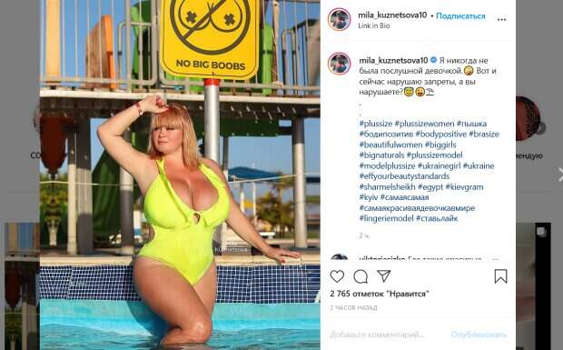 На этот раз модель опубликовала снимок, на котором похвасталась своим «проступком». Дело в том, что красотка решила сфотографироваться в бассейне прямо под шуточным знаком, запрещающим находиться рядом женщинам с большой грудью. Кузнецова гордо позирует прямо под знаком в роскошном купальнике неоново-желтого цвета. Глубокий вырез с рюшами привлекает особое внимание к главному «богатству» модели. «Я никогда не была послушной девочкой. Вот и сейчас нарушаю запреты, а вы нарушаете?», - с юмором подписала фото Кузнецова. Ее поклонники тут же отреагировали на пост модели. «Восхитительное тело», «У тебя очень красивая талия. Так держать», «Покажи им там, какими мы, украинки, можем быть», «Знак меня убил», «Ты сводишь меня с ума», «Восхитительная», «Это настоящий знак?», «Грех не принять грудастых женщин», «Значит, ты плохая девочка? Круто», «И правильно делаешь. Выглядишь шикарно и невероятно», «Вау от тебя просто глаза отвести невозможно», - пишут в комментариях. Напомним, украинка с 15-м размером бюста устроила водопад в тесном купальнике: "Можно смотреть бесконечно". Как сообщала Politeka, украинка с 15-м размером пленила своими "прелестями" в прозрачном белье: "Ах, какая женщина". Также Politeka писала, что украинка с 15-м размером "поджарила" свой знаменитый бюст, расслабившись на курорте: "Алкоголь привезла с собой".