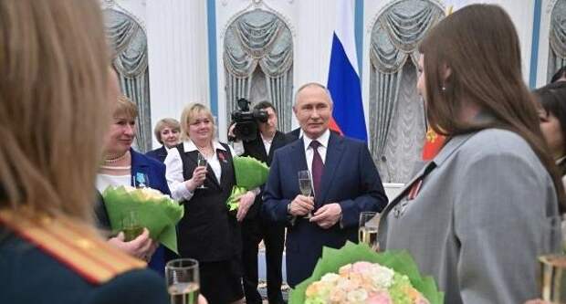 Президент России Владимир Путин поднял бокал за женщин во время праздничного мероприятия в Кремле в честь Международного женского дня. Видео опубликовали «Известия».