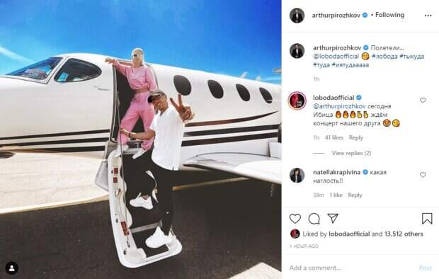 Певица наряжена в розовый спортивный костюм, обнаживший живот, и белые кроссовки, она стоит у самого входа, опершись рукой о корпус транспортного средства, яркое солнце отразилось в ее очках. Артур Пирожков стоит на ступеньках ниже в белой футболке, черных штанах и такого же цвета бейсболке. Он демонстрирует знак мира из двух пальцев с лучезарной улыбкой. "Полетели...", - подписал публикацию Ревва, а Светлана Лобода отметила в комментариях, что вместе с коллегой отправилась во Францию: "Сегодня Ибица 🔥🔥🔥🤞🤞 ждём концерт нашего друга 😍😘". Пользователи социальной сети отреагировали на совместный снимок исполнителей и начали строить версии в комментариях: "Александр, вы самый лучший исполнитель на свете ❤️ я ооооооооооооочень сильно люблю вас и вашу семью ❤️ счастья вам"; "Александр, вы самый лучший"; "Летящей походкой ты вышел из ада"; "Опять с парашютом прыгать??? 🤷♂️ Или без...🙈"; "Фит готовите?"; "Два моих единственных любимых артиста💞💞", "Какая наглость". Напомним, жена Артура Пирожкова растаяла в объятьях мужа, трогательные кадры: "Не всем дано...". Как сообщала Politeka, радостный Артур Пирожков похвастался семейной идиллией: "Пирожкова и Пироженка". Также Politeka писала, что страстный Артур Пирожков пустился в пляс прямо на улице, сеть кипит: «Бузова хореограф? ».