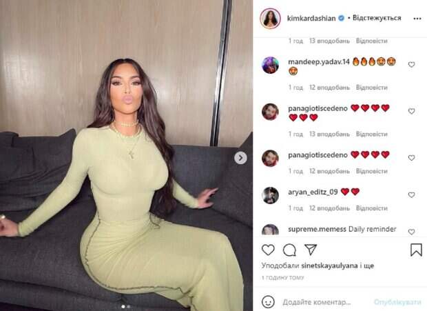На фото Ким сидит на диване в светло-салатовом платье, которое плотно обтянуло ее фигуру, подчеркнув сочные аппетитные изгибы модели. Модель разместила два фото на одном она сложила губки бантиком, поцеловав своих поклонников. Ким написала: "Не беспокоить, плиз". Сочная фигура Ким уже на протяжение многих лет дарит поклонникам женской красоты Всего лишь за час фото набрало миллионы лайков, а колонка комментариев наполнилась флюидами любви, обожания и восхищения. "Великолепная детка", "Королева❤️", "Ким делает меня счастливым