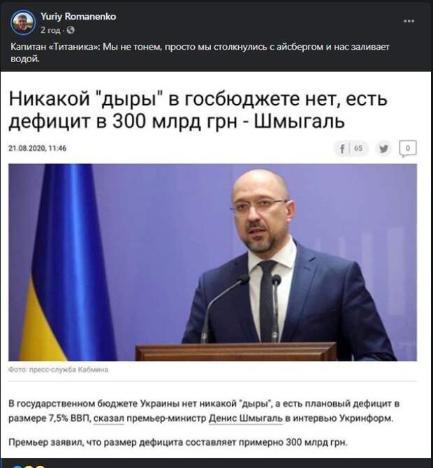 Кроме того, он подчеркнул, что сумма в 300 млрд грн согласована с международными партнерами и кредиторами. "Она абсолютно посильна для Украины, а правительство "четко понимает" источники его покрытия", - считает премьер. Такое заявление чиновника не осталось без внимания общественности. Политолог и журналист на своей страничке в Facebook ярко перефразировал слова премьера: "Капитан «Титаника»: Мы не тонем, просто мы столкнулись с айсбергом и нас заливает водой.", - отметил он. Украинцы в комментариях выразили солидарность с журналистом и не упустили момент пошутить над словами премьера: "Для кого дефицит, а для кого возможности", "Всем скинуться по 500 грн. Я правильно посчитал?", " Шел 775 день падения зеленого "Бройлера--747" над водами Дефолтового океана", "А по-моему, Шмыгаль гениален! В своём роде Так сформулировать!", "Сущая ерунда - не хватает пару копеек", "Так, маленькая течь - можно жвачкой залепить)", - писали в сети. Напомним, грядут масштабные проверки и штрафы, чьи зарплаты с 1 сентября под угрозой: "До этой даты..." Как сообщала Politeka, Нацбанку поставили условие, скандал с деньгами набирает обороты. Также Politeka писала, что украинцев обрадовали известием о зарплатах, список счастливчиков: "От 50 до 150 тысяч гривен получат. .."
