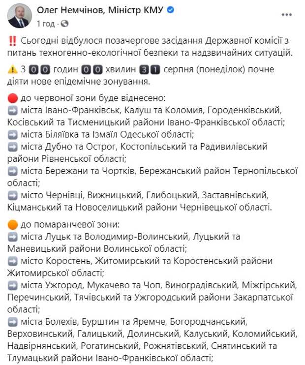 В Украине вновь обновили карантинные зоны, которые будут действительными в течение двух недель Об этом у себя в Фейсбук написал министр Кабинета министров Олег Немчинов. По его словам, сегодня состоялось внеочередное заседание Госкомиссии по вопросам техногенно-экологической безопасности и чрезвычайных ситуаций, на котором было решено заново распределить зоны, учитывая новые данным об эпидемиологической ситуации в Украине.