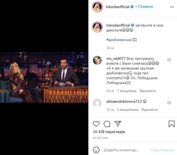 Чтобы посмотреть видео, доскрольте новость до конца. В ответ на это Лобода отметила, что на самом деле она должна была быть одетой в другое платье, но его ей привезли из Франции за день до съемок, и оно оказалась слишком маленьким. "Загляните в мое декольте", - так подписала видео певица. Ургант показал стоп-кадр, на котором можно рассмотреть откровенное платье Лободы на шоу "Голос. Дети". Сама же Лобода заверила, что она - "дюймовочка", поэтому там особо не на что смотреть". Также она рассказала, что у нее на шее висит кулон в виде перышка - талисман для дочери. Артистка убеждена, что именно к этому перу было приковано внимание зрителей, а не к ее декольте. "Лобода самая лучшая", "Мне кажется, только мертвый не обсудил ваш костюм на "Голосе", "Но нам все нравится, и ваше аккуратное декольте, и костюм", - пишут в комментариях. Напомним, Лободе в РФ неожиданно велели мирить украинцев с россиянами: "это же не София Ротару, которая...". Как сообщала Politeka, дерзкая Лобода в образе "плохой девочки" показала себя в ванной: "Дрожь по телу от твоего...". Также Politeka писала, что обольстительная Лобода не успела прикрыть декольте, черное кружево спустилось слишком низко: "завораживает".