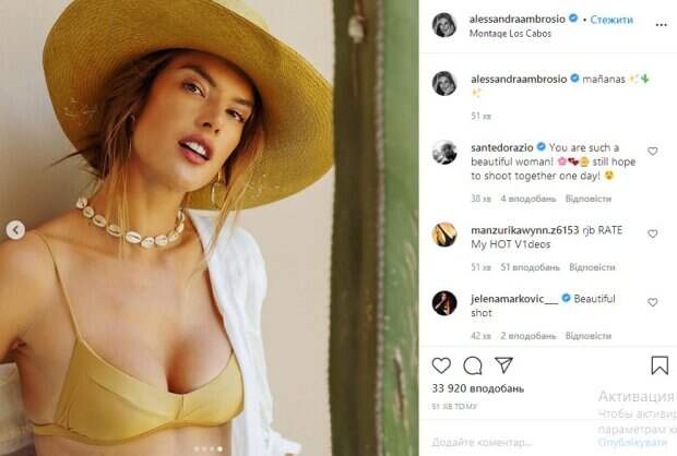 Кроме того, на голове у красотки была шляпа, а плечи знаменитость прикрыла белоснежной рубашкой. Также на снимках можно заметить сумку, которая была подобрана в цвет. «Ох уж эти глаза, Амбросио», «ты – само великолепие», «очень красиво выглядишь», «божественный вид», «не могу перестать любоваться тобой», «крутая. Можно было ничего не говорить – это и так совершенно», - пишут ее поклонники. Как мы рассказывали до этого, звезда Victoria’s Secret Аллесандра Амбросио впечатлила красотой, нарядившись в крохотный купальник во время отдыха «Спасатели Малибу», - коротко говорится в сообщении. Напомним, звезда Victoria’s Secret с красавицей-дочкой покорили смелыми кадрами в воздушных платьях. Как сообщала Politeka, звезда Victoria’s Secret в "невидимых" шортах занялась йогой, соблазнив безупречным телом. Также Politeka писала, что звезда Victoria’s Secret показала самые румяные места в мини-бикини: "Лучшая леди в мире".