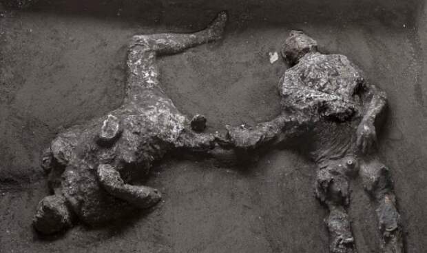 Останки двух жертв извержения Везувия 79 г.н.э. обнаружили погребенными на территории большой виллы на окраине Помпеи. Исследователи полагают, что это тела молодого раба и его богатого хозяина возрастом около 40 лет, если судить по фрагментам одежды и внешнему виду.