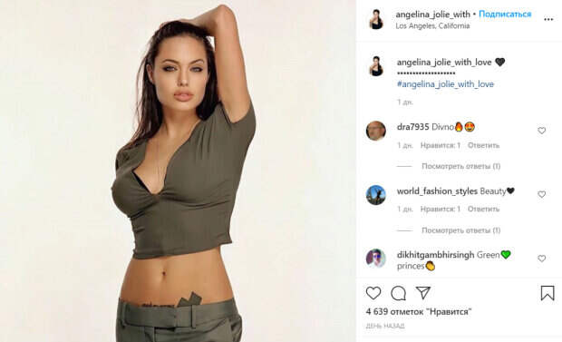Актриса подняла руку, оголив свой плоский животик. Кофточка непослушно задралась, засветив нижнее белье актрисы. Особое внимание привлекли татуировки звезды в интимном месте, которые красотка засветила, спустив штаны. Была видна надпись внизу живота, а также часть огромного черного креста. В комментариях красотке оставили массу восторженных отзывов. Поклонники отметили, что с радостью вспоминают молодую Анджелину, которая светилась красотой и здоровьем. «Красота», «Зеленая принцесса», «Форма ее тела впечатляет», «Шикарная дама», «Такая красивая», «Очень тебя люблю», «Великолепная Джоли», «Я помню фигуристую Энджи», «Красота века», «Очень красиво», - пишут пользователи сети. Ранее мы писали, что Анджелина Джоли впечатлила дерзкой красотой в невероятно красивом платье. Красный наряд подчеркнул достоинства Анджелины, а зона декольте приковала к себе внимание миллионов. Напомним, что странная дочь Анджелины Джоли сбрила волосы, ошеломив рождественским перевоплощением: как сейчас выглядит Шайло. Как сообщала Politeka, томная Анджелина Джоли зажмурилась от удовольствия, подразнив сочными «персиками» в экстра-декольте: «Конфетка». Также Politeka писала, что звезда «Великолепного века» переборщила с уколами, став двойником Анджелины Джоли: как выглядит актриса.