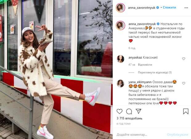 Дочь больной раком актрисы Анастасии Заворотнюк, Анна, заставила публику истекать слюнкой Как передает Politeka.net, девушка опубликовала свежее фото в своем микроблоге в Инстаграм, на котором предстала в несколько необычной позе. Счастливая Анна позировала возле пиццерии: на ней была стильная шубка, напоминающая расцветку далматинца, кремовые брюки, сникерсы и кепка.