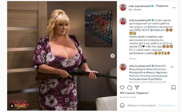Звезда опубликовала в Инстаграм фото, на котором показала свой дебют в качестве резидента "Дизель студио". Девушка будет выступать с Крутоголовым и другими актерами студии в программе DIZEL NIGHT. "Ну вот, настал долгожданный миг моего дебюта как актрисы на @stbua в мегакрутом шоу DIZEL NIGHT @dizelstudio. Узнать какая я хозяйка и как выигрываю все конкурсы вы можете уже в эту субботу в 22.22 на канале СТБ я Вас там жду! Р.S. С собой иметь хорошее настроение и улыбку", - написала Мила Кузнецова. Фанаты поставили почти тысячу лайков и написали комментарии: "Ты чудесная девушка", "Красавица ненаглядная))", "Мне интересно увидеть тебя", "Как же круто Что ты попала на такое шоу. Обязательно посмотрю его", "С наилучшими пожеланиями и удачи ... Ты мне очень нравишься", "Мне интересно очень в реале, можно увидить тебя?", "Очень круто, вы большая молодец". Напомним, украинка с 15-м размером бюста в кружевном белье показала свои красоты в полный рост А еще Politeka писала, что украинка с 15-м размером устроила страстный танец бюста прямо в ресторане Также Politeka сообщала, что украинка с 15-м размером бюста распахнула "душу" с дерзкого ракурса