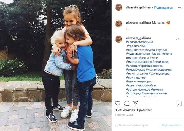 Дети Аллы Пугачевой и Максима Галкина растрогали милым совместным снимком со своей племянницей Трогательное фото детей появилось на одной из фан-страниц в Инстаграм, сообщает Politeka.net. На снимке Лиза и Гарри Галкины позируют рядом со своей племянницей – дочкой Кристины Орбакайте Клавдией Земцовой, которая при этом старше их на два года.