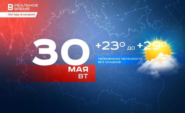 Во вторник, 30 мая, в Казани ожидается переменная облачность, без дождей. Такой прогноз дали в Гидрометцентре Татарстана. Днем воздух в Казани прогреется до +23—29 градусов. В целом по республике ожидается от +23 до +28°С, на востоке до +32 градусов. Синоптики также прогнозируют в Казани северо-восточный ветер порывами 6—11 м/с.