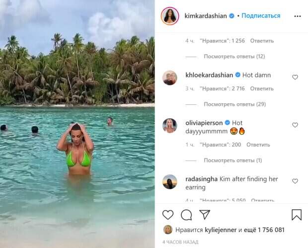 По этому случаю знаменитость организовала для своих близких роскошное празднование на частном острове. На очередном опубликованном видео Кардашьян похвасталась кадрами с райского уголка Земли Облачилась актриса в зеленый купальник, который выглядел миниатюрным на ее феноменальной фигуре. В комментариях под постом поклонники вспомнили о случае, который произошел с Кардашьян на одних из съёмок. Тогда Ким расплакалась из-за того, что возлюбленный бросил ее в воду, где она потеряла свою серьгу стоимостью 75 000 долларов. Украшение ей тогда так и не удалось найти. Ранее Ким Кардашьян показала архивный снимок, где ей 18 лет Раритетное фото не только понравилось ее фолловерам, а и разлетелось по всей сети. «Простая жизнь… мне было 18 здесь. Хлоя и я едем в Аризону, чтобы навестить Эллисон и Курта», – подписала она архивный кадр в автомобиле. Напомним, влажная Кортни Кардашьян похвасталась утехами с завидными красавчиками на частном острове: "Лучшее трио". Как сообщала Politeka, 40-летняя Ким Кардашьян в золотом декольте показала, как отрывалась на частном острове. Также Politeka писала, что Ким Кардашьян с сестричками показали идеальные формы в микро-бикини: "Девочки просто...".