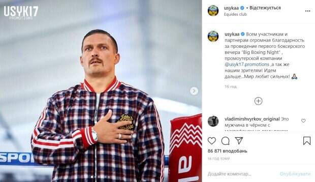 Недавно промоутерская компания Александра Усика провела свой первый турнир – Big Boxing Night в Киеве Как пишет Politeka.net, Александр Усик на своей страничке в Instagram поблагодарил всех, благодаря кому это стало возможным. Он опубликовал фотографию, на которой он слушает гимн Украины перед открытием турнира, а также серию фото с людьми, которые, видимо, помогали боксеру в огранизации турнира.