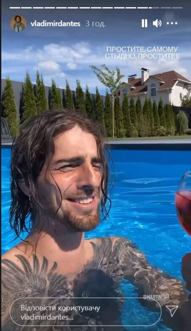 Сейчас красавчик активно ведет социальные сети, где делиться не только творчеством, но и личными кадрами. В этот раз Владимир опубликовал серию видеороликов в разделе сториз в Инстаграм, как отдыхает дома возле своего бассейна с бокалом алкоголя. Воскресенье Дантес решил не терять зря, уже солнце пригревает, вот и он решил купаться в бассейне. "Простите, самому стыдно. Простите!", - написал Владимир под видео. На видео Дантес стоит с голым торсом и бокалом и обращается к своим фанатам: "Нормальный денек, нормальный! Отличный денек, отличный! Ваше здоровье, чтоб все было у вас хорошо!", - с мокрыми и растрепанными волосами обращается Дантес на камеру слегка чокаясь бокалом. Позже Дантес спустился с бокалом в бассейн и продолжил наслаждаться "святым воскресеньем". "Ребят, простите за все эти сториз! Мне аж стыдно, но как же охир*нно, прошу прощения", - сказал Дантес отпивая красное мартини. Напомним, Дорофеева призналась, что их брак с Дантесом перестал быть прежним Также Politeka писала, что Дорофееву, оставшуюся без Дантеса, подловили в объятиях дизайнера Лободы и Тины Кароль А еще Politeka сообщала, что муж Дорофеевой Дантес с упреком обратился к украинцам
