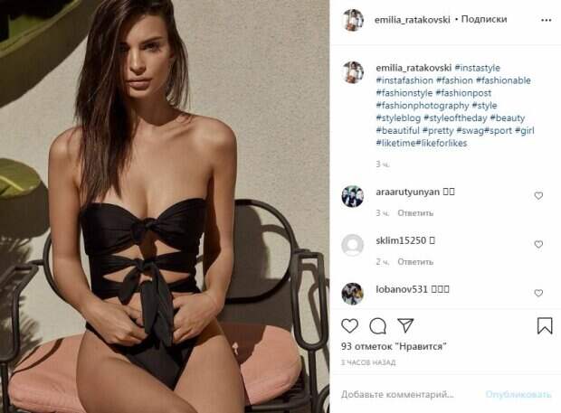 Звезда позировала сидя, обтянув свою совершенную фигуру черной тканью на трех завязочках. Купальник держался на груди, и, казалось, немного с нее сползает, что придавало кадру пикантности. Грудь соблазнительно смотрелась в кадре, и тем самым притягивала взгляд. Вырез купальника, оголяющий ее ягодицы, позволил посмотреть насколько пятая точка упругая. Красотка закинула волосы набок и страстно посмотрела в камеру, приоткрыв губы. За три часа пост в фан-группе собрал почти 100 лайков и немного комментариев в виде смайликов. Так и хочется сказать, что она божественная. Ранее мы писали, что Эмили Ратаковски была в блестящем мини-платье. Наряд оголил ровные красивые ножки модели, выглядевшие просто восхитительно. Также нельзя не посмотреть на глубину декольте наряда. Грудь в вырезе смотрелась очень соблазнительно. Красотка смотрела в камеру, завораживая своим взглядом. Напомним, Эмили Ратаковски позировала в полупрозрачном халатике без белья. Красотка приоткрыла одежду, сверкнув оголенными прелестями, а тем временем из-под прозрачной ткани едва ли не показывалось самое интимное. Модель впечатлила формами на столь жарком селфи. К тому же изысканное украшение на шее притягивало еще больший взгляд к декольте. Напомним, лохматая Эмили Ратаковски ошеломила переменами во внешности, стала еще красивее. Также Politeka писала, что Ратаковски разделась и без стеснения показала, чем ее наградила природа. Как Politeka сообщала, что Ратаковски без лифчика повеселилась перед зеркалом в томной позе