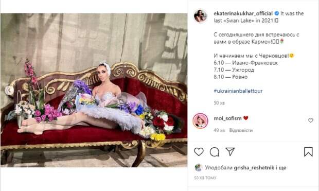 Перед камерой артистка появилась в сценическом наряде – пачке, пуантах и необычном украшении на голове. Волосы балерины зачесаны в строгую прическу, а на ее лице яркий макияж. В подписи к публикации Кухар написала: "С сегодняшнего дня встречаюсь с вами в образе Кармен!", а также добавила расписание своих выступлений на ближайшие дни. Поклонники тут же принялись комментировать снимки артистки: "И в Мариуполе ждём Вас с нетерпением", "А как же Львов?", "Красотка", "Браво! Ведь, вы, Катя, окружены цветами благодарных поклонников, по белому завидую им. Мечтаю оказаться на их месте. Знаю, Вы будете в Харькове", "Великолепная, прелесть", "Один цветочек среди моря цветов". Напомним, Кухар превратилась в настоящую злодейку, покорив жену Монатика: "Тотальный восторг". Как сообщала Politeka, Судья "Танців з зірками" Кухар неожиданно заговорила об уходе: "Буду скучать". Также Politeka писала, что Кухар из "Танців з зірками" в своем кабинете похвасталась приятной новостью: "Без преувеличения...".