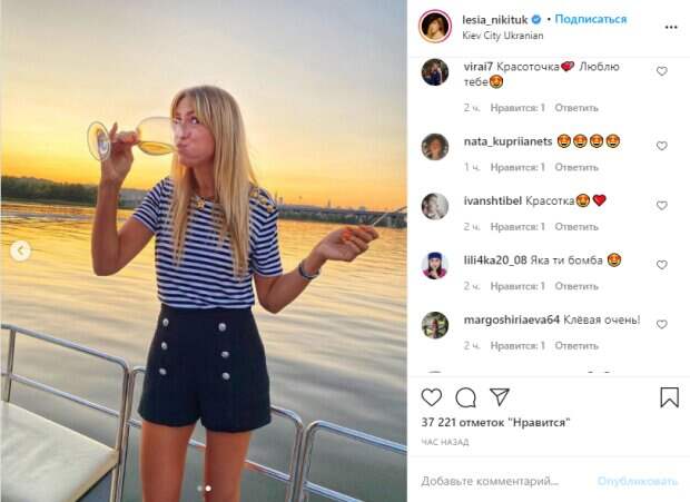 На новых фото счастливая Леся с огромным бокалом в руках позировала у реки на закате солнца. Длинноногая блондинка восхитила всех стройными ножками, а также образом, в котором позировала сегодня. «Крутой вечер! И крутое завершения съемок тревел шоу @lemarshrutka_official