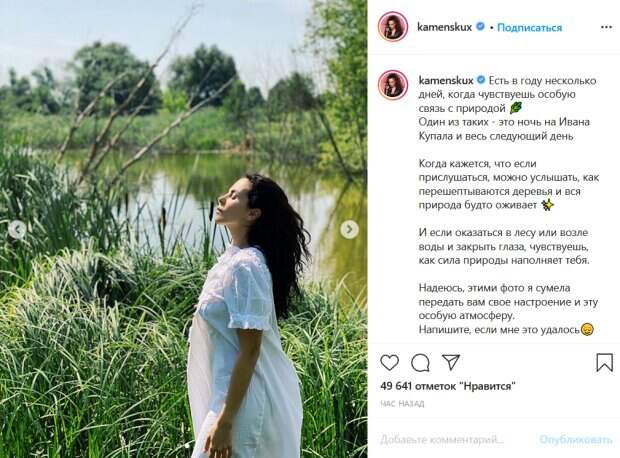 Настя Каменских показала себя в единении с природой по случаю праздника Ивана Купала Популярная украинская певица поделилась чувственными фотографиями в своем Инстаграм, передает Politeka.net. Звезда поделилась своим мнением об одном из самых мистических праздников в году – Ивана Купала. Так, Каменских призналась, что в этот день чувствует особую связь с природой.