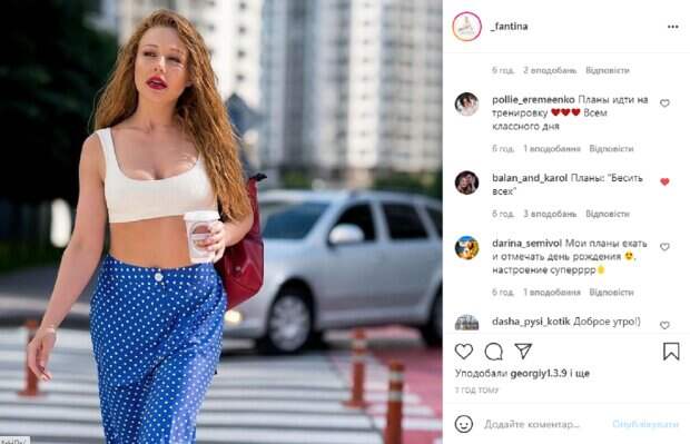 Как видно, Тина запечатлена на прогулке, похоже она вышла в город за кофе, или взяла его по дороге куда-то. Перед камерой звезда появилась в коротком узком топе белого цвета и длинной синей юбке в белый горошек интересного фасона. Этот наряд красиво подчеркнул идеальные формы и упругое декольте певицы. Ее волосы распущены и небрежно уложены, а на лице легкий макияж с любимой красной помадой, она не смотрит в камеру. В подпсии к фотографии говорится: "Доброе утро! Как ваше настроение? Какие планы на сегодня?". Пользователи тут же принялись активно комментировать новое фото звезды, засыпая ее комплиментами и отвечая на вопросы. "Доброе утро, семья", "Планы идти на тренировку. Всем классного дня!", "Планы: "Бесить всех", "Всем привет, хорошего выходного дня, и хорошего настроения", "И куда это она направилась? Красиво", "Просто красотка", "Роскошная женщина", - пишут фанаты комментариях. Напомним, Тина Кароль поделилась рецептом оригинальной паски без выпечки: "получится у каждой хозяйки". Как сообщала Politeka, Кароль призналась, кому принадлежит ее сердце, и это не Балан: "Люблю его безумно". Также Politeka писала, Тина Кароль закатила сцену ревности известному ведущему: "Кто здесь была до меня? ".