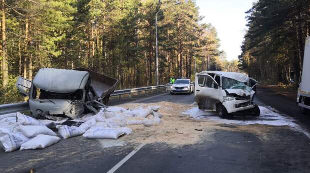 Из опубликованных полицией кадров следует, что в результате аварии на дороге оказались десятки мешков с сахаром, которые находились в кузове автомобиля УАЗ.