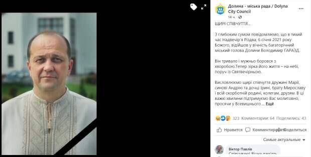 "С глубокой грустью сообщаем, что в тихое время под вечер Рождества, 6 января 2021 года, отошел в вечность многолетний городской голова Долины Владимир Гаразд. Он длительно и мужественно боролся с болезнью", - говорится в сообщении. Владимир Гаразд - украинский общественно-политический деятель, в 2006-2020 годах был городским головой Долины, Ивано-Франковская область, с 2007 по 2019 год - президент ассоциации "Энергоэффективные города Украины". Украинцы в комментариях не могут поверить в то, что Владимира Гаразда уже нет в живых. Кроме того, они оставляют слова поддержки и сочуствия для семьи мужчины. Многие также вспоминали о нем только в хорошем свете. "Искренние соболезнования. Пусть с Богом почивает. Царство Небесное", "Безумно больно на сердце. Он делал только добро", "Вечная память! Добрые дела для края и Украины будут славить твое имя, дружище! Искренние соболезнования семье!", "Не укладывается в голове, что болезнь взяла свое", "Разум отказывается такое воспринимать... Как же так? Столько планов, энергии, умений!". Стоит напомнить, что он не первый мэр, который умер от коронавируса. Так, мэр Харькова Геннадий Кернес умер от осложнений после заражения коронавирусом. Напомним, оборвалась жизнь выдающегося украинца, страна потрясена. Как сообщала Politeka, остановилось сердце именитого украинского комика. Также Politeka писала, что остановилось сердце выдающегося украинца, который месяц боролся с вирусом.