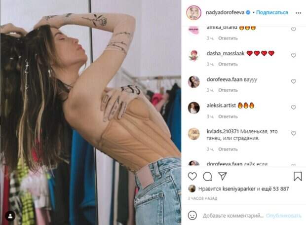 Певица Надя Дорофеева вызвала переполох чувственным образом и не менее интригующей позой Как передает Politeka.net, 30-летняя артистка опубликовала свежее фото в своем микроблоге в Инстаграм, на котором предстала в гардеробной. На знаменитости был корсет телесного цвета и модные джинсы с высокой талией, а также прозрачные перчатки с узором.