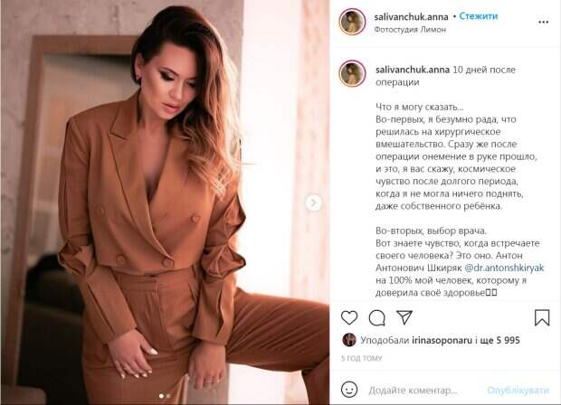 Проблемы с шеей у звезды появились из-за старой травмы. Десять лет назад Анна упала с лошади во время съемок исторического фильма. Спустя года дикая боль дала о себе знать с новой силой, Анне понадобилась срочная операция. «Во-первых, я безумно рада, что решилась на хирургическое вмешательство. Сразу же после операции онемение в руке прошло, и это, я вас скажу, космическое чувство после долгого периода, когда я не могла ничего поднять, даже собственного ребёнка», - поделилась артистка. Вместе с тем она призналась, что страдания пока, к сожалению, не закончились. «Но не все так радужно, как кажется на первый взгляд… Моя рука, где не правильно поставила медсестра катетер болит до сих пор. Гематома ещё не прошла", - призналась она. Также Саливанчук призналась, что пока не может обойтись без уколов обезбаливающего. "Пыталась несколько дней терпеть, но это было очень плохая идея. Боль невыносимая. Но врач говорит, что это в рамках нормы и реабилитация идёт по плану. И даже лучше! Так как шрам быстро затягивается и скоро будет совсем не заметный", - рассказала она. Саливанчук поблагодарила всех, кто поддерживает ее в это непростое время. Напомним, жена продюсера "Квартал 95" показала кадры из операционной, что известно о ее состоянии: "Уже через полчаса. .." Как сообщала Politeka, жена продюсера "Квартал 95", пустившись в пляс, разрешила себе быть неидеальной: "Дитя природы" Также Politeka писала, что жена продюсера "Квартал 95", показав красивое декольте, призналась в чувствах к женщинам: "Не перестану..."