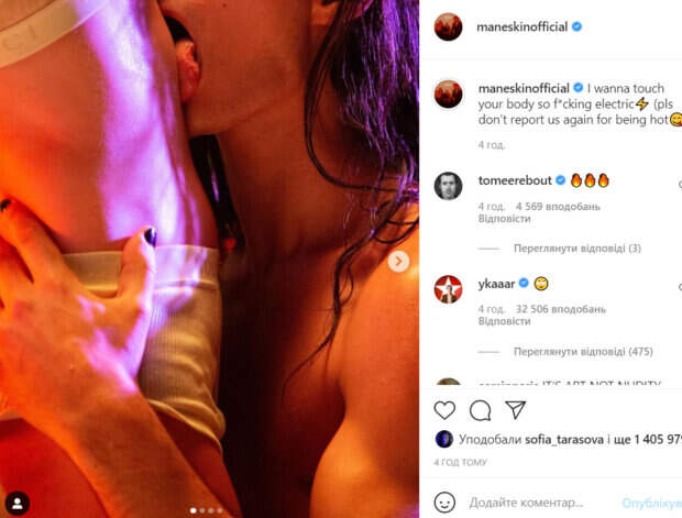 В Инстаграм группы много провокационных фото. Они не стесняются фотографироваться без одежды, а также в эпатажных нарядах. Например, Дамиано Давид недавно устроил фотосессию в женском нижнем белье. В этот раз эпатировать публику решили барабанщик и бас-гитаристка. Они сфотографировались в нижнем белье, устроив взрослые игры. На одном фото мужчина крепко прижал к себе коллегу по группе, а на втором облизал ее. «Я хочу прикоснуться к твоему телу так чертовски электрически», - подписали фото артисты, попросив поклонников не жаловаться на их слишком откровенные фото. Напомним, что красавчик из Måneskin показал свою девушку, потрясающая красотка: "Что она в нем нашла". Как сообщала Politeka, красавчик из Måneskin удивил видом в чулках и женском лифчике: «Я хочу быть…». Также Politeka писала, что красавчики из Måneskin поразили внешностью до популярности: "Уже в детстве...".