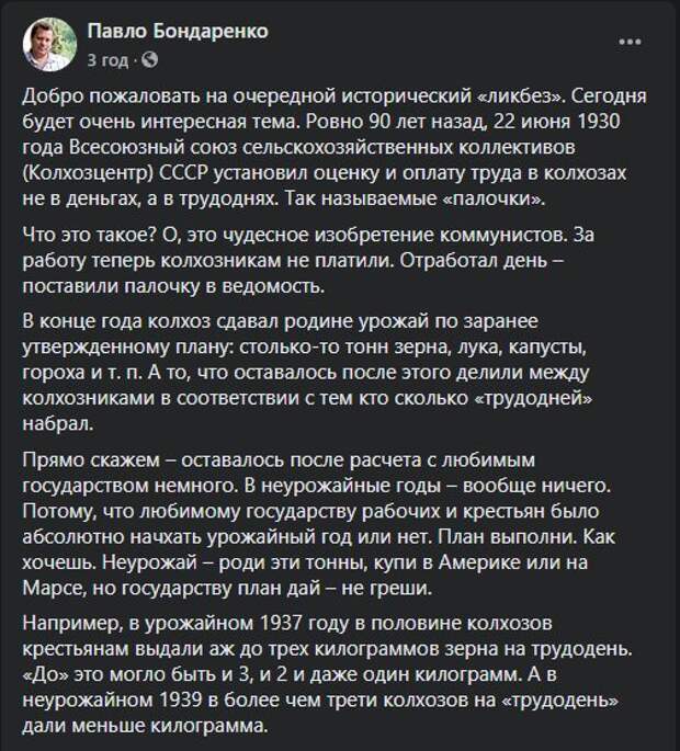 Историк Павел Бондаренко рассказал о тяжком труде во времена СССР Как передает Politeka.net, пост он опубликовал на своей страничке в Facebook. Историк напомнил, что 22 июня 1930 года Всесоюзный союз сельскохозяйственных коллективов СССР установил оценку и оплату труда в колхозах не в деньгах, а в трудоднях.