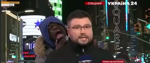 В Нью Йорке на главной площади города – «Таймс-Сквер», где сегодня ночью произошла стычка между полицией и протестующими, пара афроамериканцев попыталась мешать прямому включению украинских журналистов в эфир телеканала «Украина 24». В ролике, опубликованном телеканалом, видно, как темнокожий протестующий, широко раскрывая рот, кричит из-за спины журналиста Игоря Пупкова, а тот пытается прогнать его из кадра.