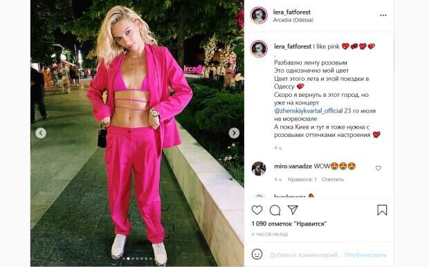 «Разбавлю ленту розовым. Это однозначно мой цвет. Цвет этого лета и этой поездки в Одессу. Скоро я вернуть в этот город, но уже на концерт «Женского Квартала». А пока Киев и тут я тоже нужна с розовыми оттенками настроения», - написала Товстолес. Этот пост она сопроводила своими снимками, сделанными в Одессе. На них артистка позирует в ярко-розовом брючном костюме с пиджаком. При этом под ним на ней был лишь лиф от купальника с необычными завязками. Он также был розового цвета. Поклонники тут же отреагировали на пост звезды. «Хороша», «Ну какова красота!», «Ух ты-ы-ы!», «Ну ты красивая», - пишут люди в комментариях к снимкам. Напомним, Товстолес из "Женского квартала" рассказала о своей "новой" профессии: "Жизнь разделилась на до и после". Как сообщала Politeka, Лера Товстолес в наряде с декольте показала развлечения в машине. Также Politeka писала, что звезда "Женского квартала" Товстолес с гордостью показала, с кем делит постель: "Девчонка моя".