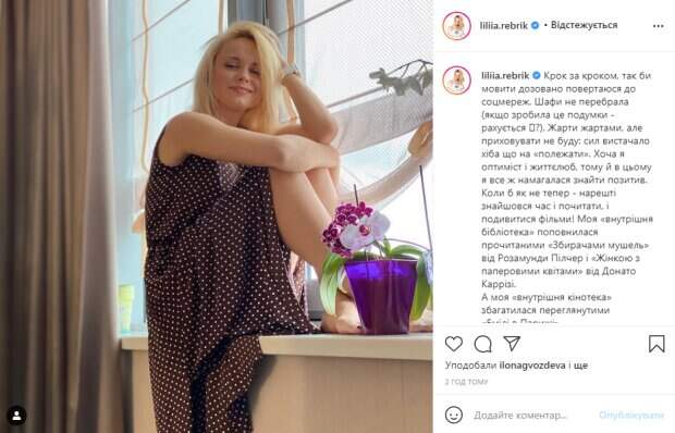Недавно телезвезда под конец зимы подхватила коронавирус и вынуждена была уйти на самоизоляцию. И после некоторой паузы в соцсетях, она вернулась к своим фолловерам и поделилась новостями. В своем микроблоге Лилия опубликовала милое домашнее фото, на котором позирует в интересном образе. Как видно, красотка залезла на подоконник и удобно умостилась у окна рядом с горшком с цветущей орхидеей. Перед камерой телеведущая появилась в длинном темном платье в белый горошек, ее волосы небрежно уложены, а на лице легкая сонная улыбка. В подписи к фотографии Ребрик рассказала о своей самоизоляции и о плюсах, которые в ней нашла. "Шутки шутками, но скрывать не буду: сил хватало разве что на "полежать". Хотя я оптимист и жизнелюб, так и в этом я все же пыталась найти позитив. Когда, если бы не сейчас – наконец нашлось время и почитать, и посмотреть фильмы!", - призналась Лилия. Она также рассказала, что успела прочитать и посмотреть за дни своего карантина. И поделилась, что уже устала болеть и хочет поскорее вернуться к нормальной жизни. "Но на самом деле считаю уже дни до завершения болезни: и устала, и откровенно надоело болеть", - говорит Ребрик. Напомним, Лилия Ребрик раскрыла секреты закулисья на работе: "Чем ведущие занимаются во время. ..". Как сообщала Politeka, озорная Лилия Ребрик взволновала фигурой в приталенном костюме с открытыми плечами: "Настроение сказочное". Также Politeka писала, Лилия Ребрик назвала украинцам эффективное оружие для борьбы с серыми буднями: "Сразу наполнены смыслом".