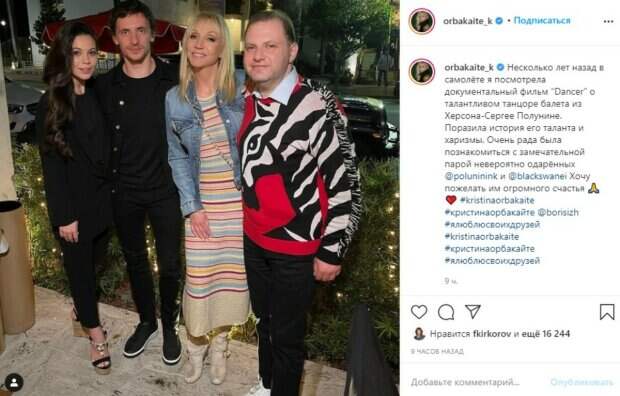 Блондинка с кокетливой улыбкой приподняла ножку, положив сверху руку и слегка подавшись вперед. "Несколько лет назад в самолёте я посмотрела документальный фильм “Dancer” о талантливом танцоре балета из Херсона - Сергее Полунине. Поразила история его таланта и харизмы. Очень рада была познакомиться с замечательной парой невероятно одарённых @poluninink и @blackswanei Хочу пожелать им огромного счастья