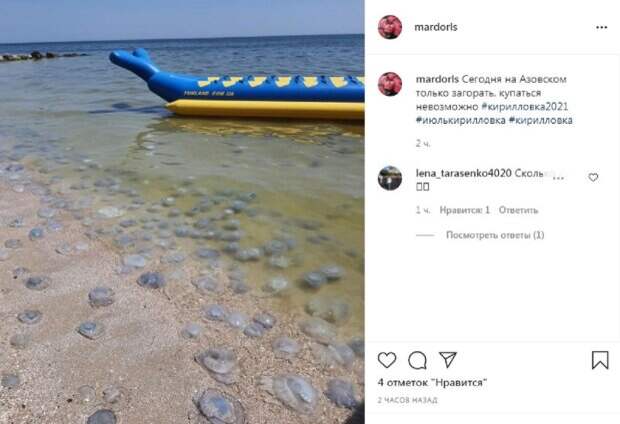 На популярных украинских курортах таких как, Кирилловка и Лазурное фиксируется настоящее нашестие медуз, из-за которого отдых становится просто невозможным Люди приехавшие на море даже не могут толком искупаться из-а сильного жжения. На кадрах видно, что пляжи Кирилловки и Лазурного усеяны мертвыми медузами.