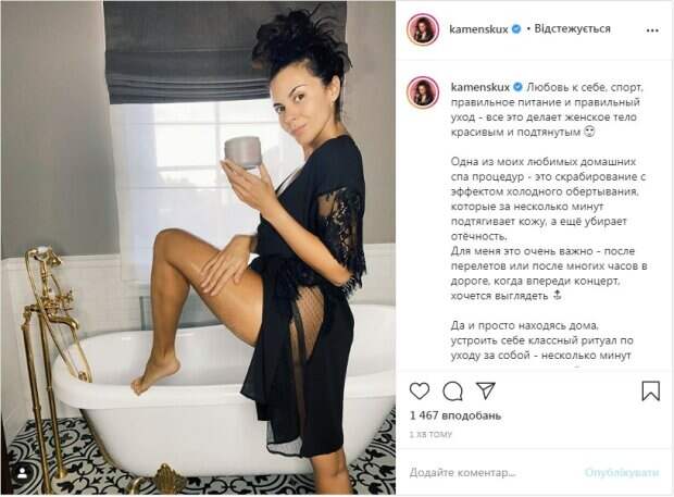 Популярная украинская исполнительница Настя Каменских подразнила пикантным кадром в ванной Об этом сообщает Politeka со ссылкой на Instagram знаменитости. На фото она позирует в черном кружевном пеньюаре, поставив ногу на ванную. «Любовь к себе, спорт, правильное питание и правильный уход - все это делает женское тело красивым и подтянутым