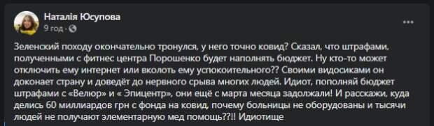 Сказал, что штрафами, полученными с фитнес-центра Порошенко будет наполнять бюджет. Ну кто-то может отключить ему интернет или вколоть ему успокоительного?? Своими видосиками он доконает страну и доведёт до нервного срыва многих людей", - считает волонтер. Также Юсупова отметила, что властям нужно заняться команиями и ресторанами, которые попадались на скандала еще весной этого года. "Идиот, пополняй бюджет штрафами с «Велюр» и «Эпицентр», они ещё с марта месяца задолжали! И расскажи, куда делись 60 миллиардов грн с фонда на ковид, почему больницы не оборудованы и тысячи людей не получают элементарную мед помощь?!", - поинтересовалась волонтер. Ранее Владимир Зеленский, который все еще находится на самоизоляции в клинике «Феофания» из-за китайского вируса, рассказал об изменениях в своем самочувствии. По его словам, несмотря на позитивный тест на вирус, его общее состояние идет на поправку Напомним, состояние Зеленского резко изменилось, Мендель раскрыла детали: что известно. Как сообщала Politeka, Зеленского призвали освободить палату для тяжелобольных: "Пациенты уже лежат в коридорах". Также Politeka писала, что Зеленского призвали лечиться, как большинство украинцев: "Давай в обычную больницу".