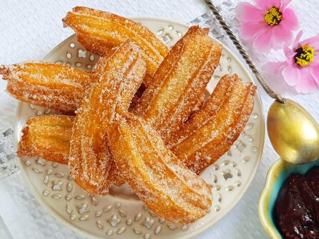 Испанское заварное жареное тесто готовится пожалуй проще, чем практически любой десерт. Стакан муки с добавлением яиц и масла мы превратим в хрустящие чуррос, а затем подадим к чаю. Для приготовления нам понадобится 150 граммов муки, 100 граммов сливочного масла, 250 миллилитров воды, 3 яйца, щепотка соли, сахарная пудра и растительное масло.