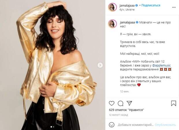 Девушка избавилась от лифчика, прикрыв обнаженные прелести золотистой курточкой. Кроме того, на ней была широкая кожаная юбка. Звезда, будто от удовольствия, закрыла глаза и подняла руку к голове. Счастливая улыбка играла в этот момент на ее лице. В подписи Джамла объяснила свое игривое настроение: "Альбом «МЫ» увидит свет 12 марта.