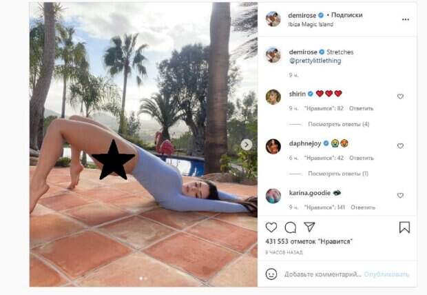 Как известно, сейчас модель отдыхает на Ибице. Об этом пишет Politeka.net со ссылкой на страничку знаменитости. "Растяжки", - подписала фото девушка. Фанаты поставили более 400 тысяч лайков и написали комментарии: "Королева снова наносит удар", "Мне пришлось полюбить это дважды", "Я пытаюсь стать твоим учителем йоги", "Самая красивая, лучшая, самая привлекательная и привлекательная девушка в мире", "Красивое растягивающееся фантастическое тело и твоя прелесть", "Мой райский восторг идеально прекрасен", "Я скучаю по чату с тобой", "сердце ты в форме", "Какая богатая и красивая, спасибо, что баловали меня". Мы писали, что модель купальников и нижнего белья Деми Роуз впечатлила формами в крохотном купальнике. Модель позировала в персиковом бикини на прозрачных бретельках, что добавляло образу большей пикантности. Звезда натянула на грудь небольшие лоскутки ткани, которые едва что-то прикрывали, почти сливаясь с цветом кожи. Напомним, Деми Роуз распахнула прозрачный халатик, заставив фанатов стонать от восторга А еще Politeka писала, что Деми Роуз прикрыла необъятные формы крошечными кусочками ткани, подразнив воображение Также Politeka сообщала, что сочная Деми Роуз бесстыдно распахнула куртку, под которой ничего нет