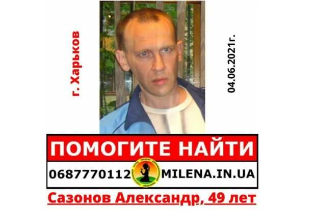 В Харькове вторую неделю разыскивают человека Последний раз 49-летнего Александра Сазонова видели 24 мая в Харькове на улице Владислава Зубенко. Приметы: рост 170 см; худой; сутулится; волосы русые; глаза серо-голубые. Особые приметы: отсутствуют передние зубы; на правом плече есть татуировка — оскал тигра; на левой кисти между указательным и большим пальцем татуировка — римская цифра 2.