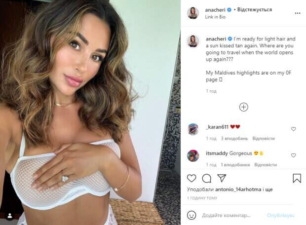 Как видно, на новом снимке Ана запечатлела себя сама, она стоит в ванной комнате и томно позирует в объектив. Перед камерой девушка с аппетитным телом появилась в светлом нижнем белье из тонкой полупрозрачной ткани, которая едва прикрывает все самое интимное. На грудь модель кокетливо положила ладошку, как будто прикрывая ее. Волосы Чери распущены в пышной красивой укладке, а на ее лице легкий макияж со сладким блеском на губах, она кокетливо смотрит в камеру. В подписи к фотографии Ана написала: "Я готова к светлым волосам и снова загорелому солнцу. Куда вы собираетесь отправиться, когда мир снова откроется? Мои основные моменты на Мальдивах находятся на моей странице". Поклонники тут же кинулись обсуждать новое фото фитнес-модели, засыпая ее комплиментами и восторженными комментариями. Напомним, Ана Чери приковала взгляд к своим "бутонам" в развратном платьице. А еще Politeka писала, что несравненная Ана Чери поиграла сочными объемами в кружевном лифчике. Также Politeka сообщала, что жаркая Ана Чери подразнила расстегнутой молнией на тесном топике.