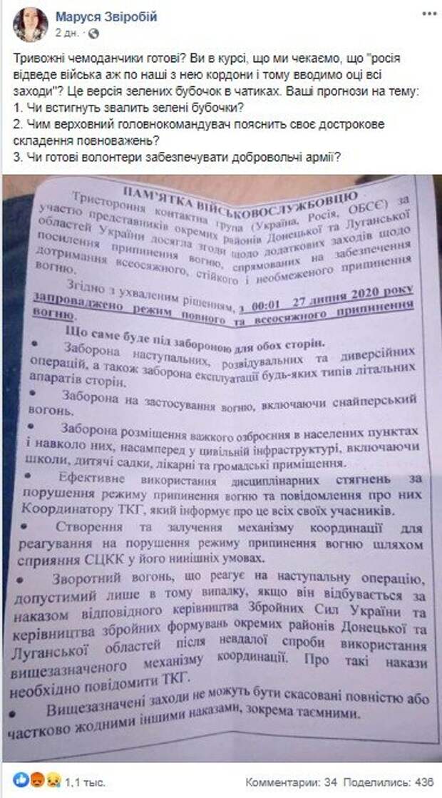 Активистка Маруся Звиробий сделала мощное заявление после объявления о прекращении огня на Донбассе Она опубликовала памятку военнослужащему и поделилась своим мнением в Facebook. "Тревожные чемоданчики готовы? Вы в курсе, что мы ожидаем, что россия отведет войска вплоть по наши с ней границы и поэтому вводим эти все меры"?