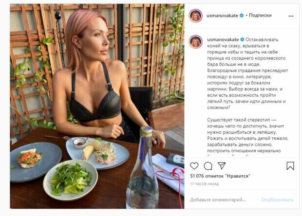 Известная фитнес-тренер Екатерина Усманова показала себя и рассказала о стереотипах На фото красотка сидела за столом, оставаясь в кожаном топе и штанах. Екатерина отвела взгляд от камеры, а волосы оставила распущенными. На кадре можно увидеть несколько блюд, а на фоне стена. Девушка без стыда демонстрировала свою фигуру и плоский животик.