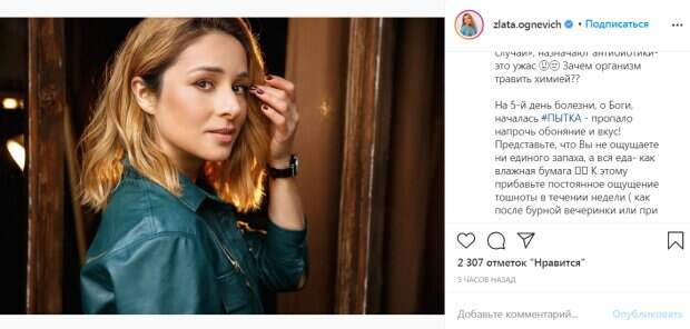 "Все началось поздно вечером, я почувствовала что-то неладное, всю ночь невидимое кольцо сжимало шею и в горле сильно першило. Я периодически рассасывала пастилки от ангины, они обычно меня спасают. Утро. Все признаки начала ОРВИ, приняла обычные лекарства. Маску, перчатки в маркет нвдягнула, считаю, когда ты болен любой простудой - ты просто обязан носить средства защиты, чтобы других не заражать", - отметила она. По словам певицы, во время лечения она само себе ставила уколы. "Теперь главное: в течение 8 дней я сама внутримышечно + подкожно вводила это лекарство. Это при том, что я панически боюсь уколов, и мне пришлось 30 минут уговаривать себя перед первым)))", - рассказала Злата. На фоне этого она процитировала слова своей сестры: "Захочешь жить, и не такое будешь делать". Еще один интересный момент, которым поделилась певица - то, что когда к ней частично вернулся нюх, все цитрусы стали пахнуть рыбой. В комментариях фолловеры пожелали певице скорейшего выздоровления. "Выздоравливайте, не болейте и берегите себя", "Спасибо за то, что делишься с нами всем! Ешь и пей витаминки", "Выздоравливайте!" - пишут в комментариях. Напомним, Злата Огневич подчеркнула идеальные изгибы черным шелком. А еще Politeka писала, что Злата Огневич искупалась в лучах солнца посреди улицы и решилась на откровение. Также Politeka сообщала, что Злата Огневич искупалась в лучах солнца посреди улицы и решилась на откровение.