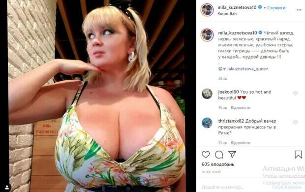Уточним, что на снимке Кузнецова позирует в платье с экстремальным декольте, эффектно демонстрируя главную гордость. «Красотень!», «магический вид», «такая горячая и красивая», «выглядишь очень красиво», «вау, а ты красотка», «вот это они огромные у тебя», —пишут ее поклонники. До этого сообщалось, что украинская модель Мила Кузнецова, выдающийся бюст которой отметили в Национальном реестре рекордов Украины, похвасталась своим достоинством «Так выглядит счастье 💜», - коротко подписала снимок модель. На фото девушка позирует напротив стадиона «Олимпийский» в Киеве. Мила одета в короткое белое платье, пуговицы которого расстегнуты на груди, обнажая внушительные формы. Отметим, у фолловеров модели возник вопрос по этому поводу. «А на пуговицы платье застегнется или нет?» - спросили в комментариях. При этом Кузнецова ответила, что не застегнется. Напомним, украинка с 13-м размером груди выставила напоказ неприкрытые булочки. А еще Politeka писала, что украинка с 13-м размером груди показала из кустов бесстыжее декольте. Также Politeka сообщала, что украинка с 13 размером бюста едва не растеряла гордость, пока танцевала.