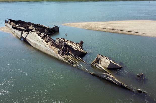 Из-за падения уровня воды в Дунае на поверхности реки вблизи сербского города Прахово показались обломки затопленных во время Второй мировой войны году немецких военных кораблей