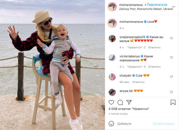 Девушка активно ведет социальные сети и делится с поклонниками моментами из жизни. На этот раз Миша поделилась новым фото на своей странице в Инстаграм. На снимке она на пляже на фоне моря машет в камеру вместе со своим сыном - Мартином. Как известно, имя отца сына она не афиширует, ранее в интервью в "Світське життя" она рассказала, что они с бывшим избранником не общаются. "Люблю", - подписала фото певица. Поклонники засыпали певицу приятными словами в комментариях, и также пользователи сети подметили, что малыш похож на известного артиста: "Мартин такой хорошенький Куклëнок мамин