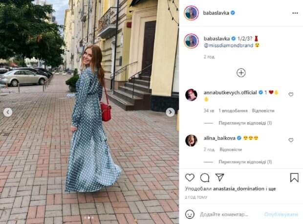 На новых снимках Слава запечатлена на прогулке по городу, куда вышла в удивительном образе. Как видно, перед камерой звезда появилась в длинном серо-зеленом платье в белый горошек, которое красиво подчеркнуло ее изящные формы. Свой образ певица дополнила удобной и яркой обувью и красной сумкой. В подпсии к фотографиям Каминская предложила поклонникам выбрать, какое из трех фото им нравится больше всего. Пользователи тут же начали отвечать в комментариях, засыпая артистку комплиментами: "Как же меня прет от горошка", "Лучшая, платье огонь", "Классный горох, тоже люблю очень", "Шикарное платье на прекрасной леди", "Красотка", "Ты лучшая", "Красиво", "Такая милая", "Красотка", "Супер", "Восхитительная". Напомним, Каминская после распада "НеАнгелов" вышла на сцену в "мужском" наряде: "Обожаю!". Как сообщала Politeka, Каминская из "НеАнгелов" дала повод для зависти, как может выглядеть по утрам: "С Бодрым...". Также Politeka писала, что Каминская после распада "НеАнгелов" показала себя на высоте: "Продолжаю развиваться...".