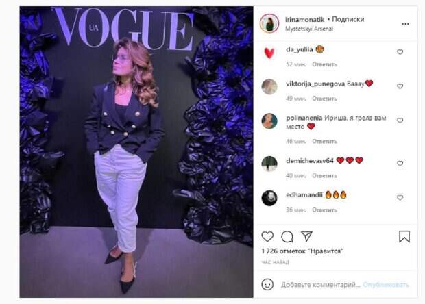 Красотка надела стильный пиджак и штаны, а образ дополнила каблуком. "Вот и началась неделя моды в Киеве", - написала Ирина Монатик под публикацией. Фанаты поставили более тысячи лайков и написали комментарии: "Вау", "Ириша, я грела вам место", "Шик", "Огонь". "Ukrainian Fashion Week" (Украинская неделя моды, - прим. ред.) будет проходить в Киеве со второого по пятое сентября. Данное мероприятие проводится в Украине с 1997 года. На показе моды учавствуют десятки зарубежных и украинских дизайнеров. Напомним, Жена Монатика похвасталась грандиозным сюрпризом от любимого на берегу моря А еще Politeka писала, что Монатик довел до слез жену Влада Ямы и заставил Полякову аплодировать Также Politeka сообщала, что подросшие сынишки судьи "Голосу країни" Монатика поразили внешностью
