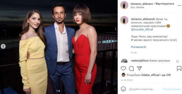 Показательно, что Александр опубликовал два кадра. Один был сделан посреди банкетного зала, а второй – на балконе. Выглядел артист очень довольным. «Дима, ты, конечно, окружил себя невероятными красотками! Лида, Нино, рад знакомству! И желаю яркого творческого пути!)», - написал Стоянов, явно позавидовав Монатику. В комментариях артисту оставили массу приятных слов и колких отзывов. «Катя лучше всех», «Какие красивые люди», «Действительно красотки!», «А где в это время была Кухар?», - пишут пользователи сети. Стоит отметить, что Александр Стоянов и Екатерина Кухар являются одной из самых красивых пар украинского шоу-бизнеса. Их отношения родились на сцене, где они долгое время были партнерами. Как известно, Кухар на 6 лет старше Стоянова. Кроме этого, у нее есть сын от первого брака. Напомним, что Кухар из «Танців з зірками» с мужем, умостившись прямо на полу, сообщили украинцам хорошую новость: фото. Как сообщала Politeka, Кухар из «Танців з зірками» с полупрозрачной юбкой и открытым декольте появилась на публике: эффектные кадры. Также Politeka писала, что Кухар из «Танців з зірками» показала дочь, которая пошла по ее стопам: «Мой солнечный зайчик».