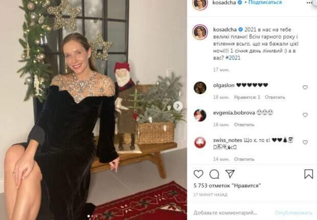 Телеведущая Катя Осадчая порадовала фанатов своим новогодним образом Свежие снимки ведущая шоу "Світське життя" опубликовала в своем микроблоге Instagram. Ради фотографий Катя Осадчая примерила роскошное черное платье, декольте на котором сделано из блестящих бусинок. На снимках великолепная Катя Осадчая сперва уселась на маленькую лавочку, акцентируя внимание фотографа на своих длинных ногах.